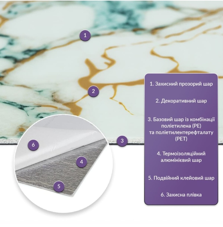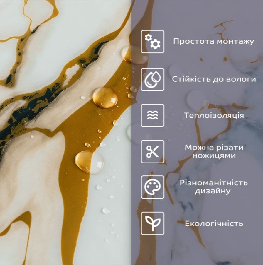 Це покриття щільно тримається, не відклеюється з часом, легко миється і ідеально підходить для кухонь, ванних кімнат, меблів, акцентних стін,спальні та офісних приміщень
