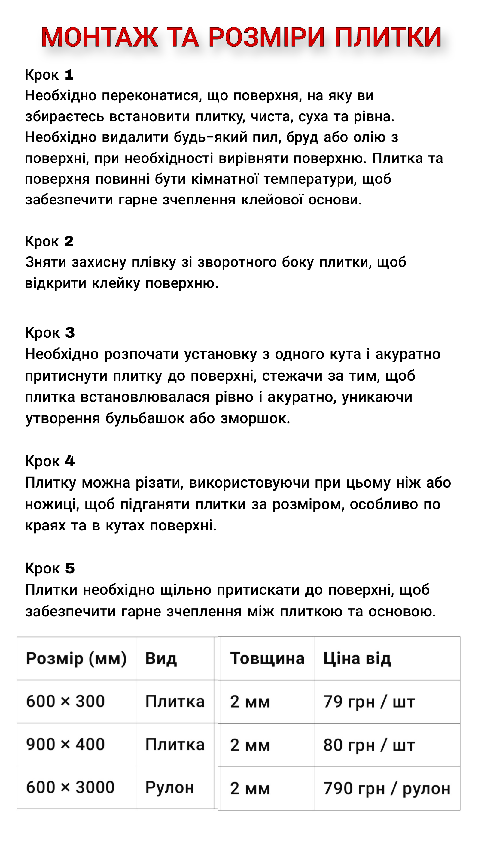 Для тих, хто цінує свій час,комфорт і стиль — ми обрали найкраще покриття! Самоклеюча ПЕТ ПЛИТКА — це справжнє задоволення не тільки для очей, а й для рук. Вона легко монтується, не потребує спеціальних навичок або додаткових матеріалів, виглядає сучасно та красиво.